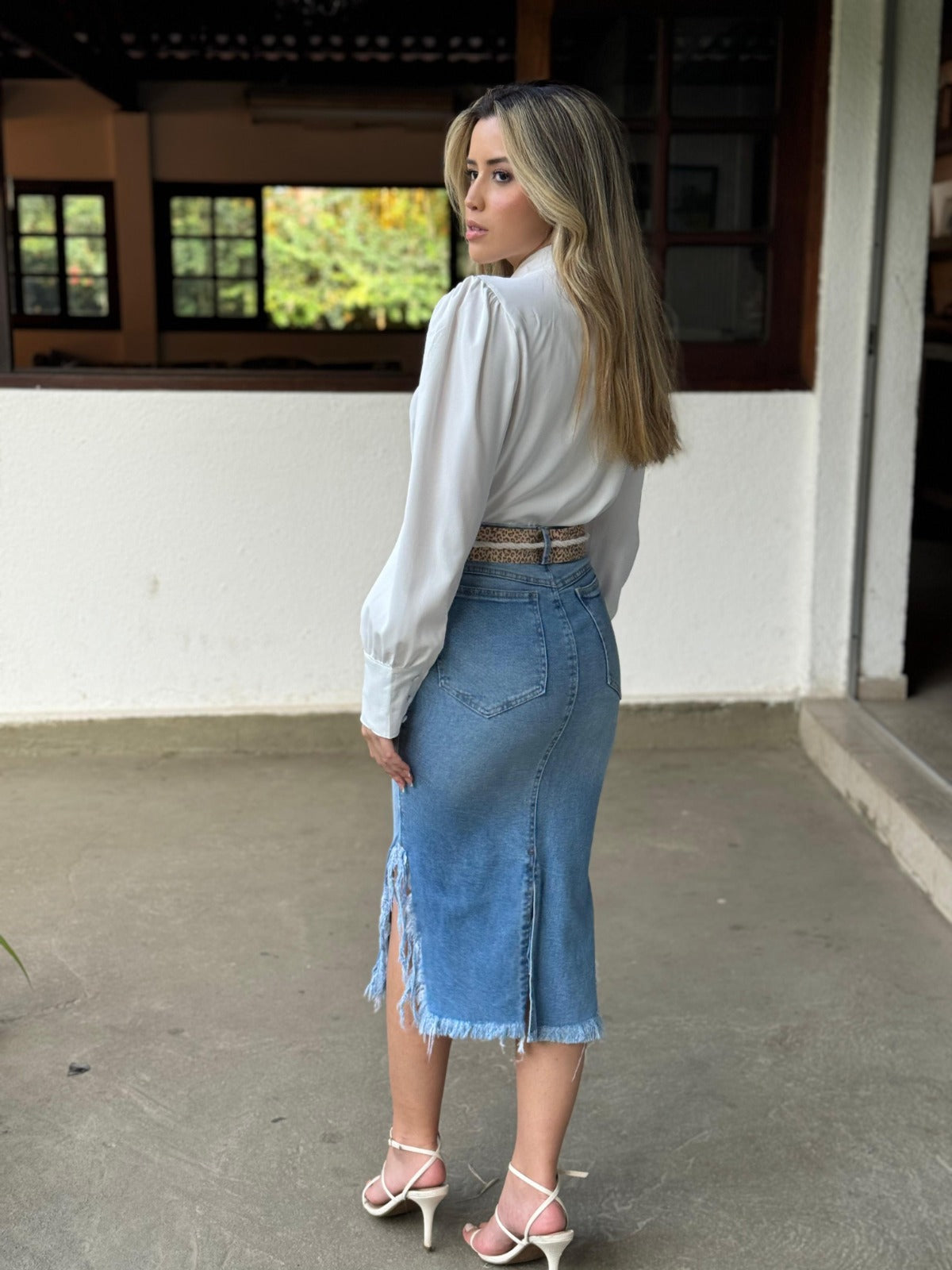 Renove seu guarda-roupa com a Saia Jeans Mídi Destroyed com Elastano e Cinto Cobra, a peça perfeita para compor looks cheios de atitude e estilo. Com modelagem mídi e caimento moderno, essa saia une o clássico do jeans com o toque fashion do acabamento destroyed, trazendo personalidade ao visual.
