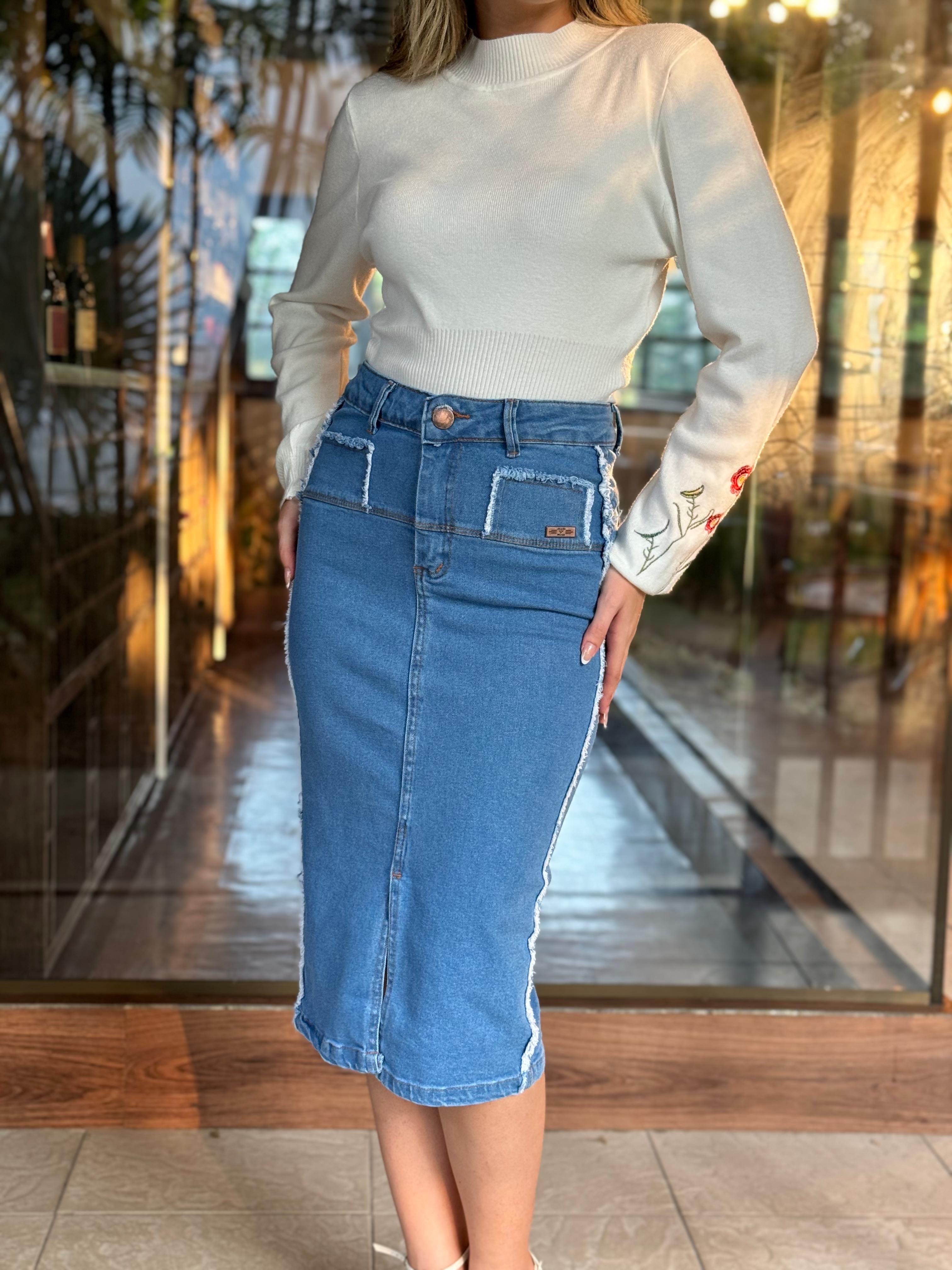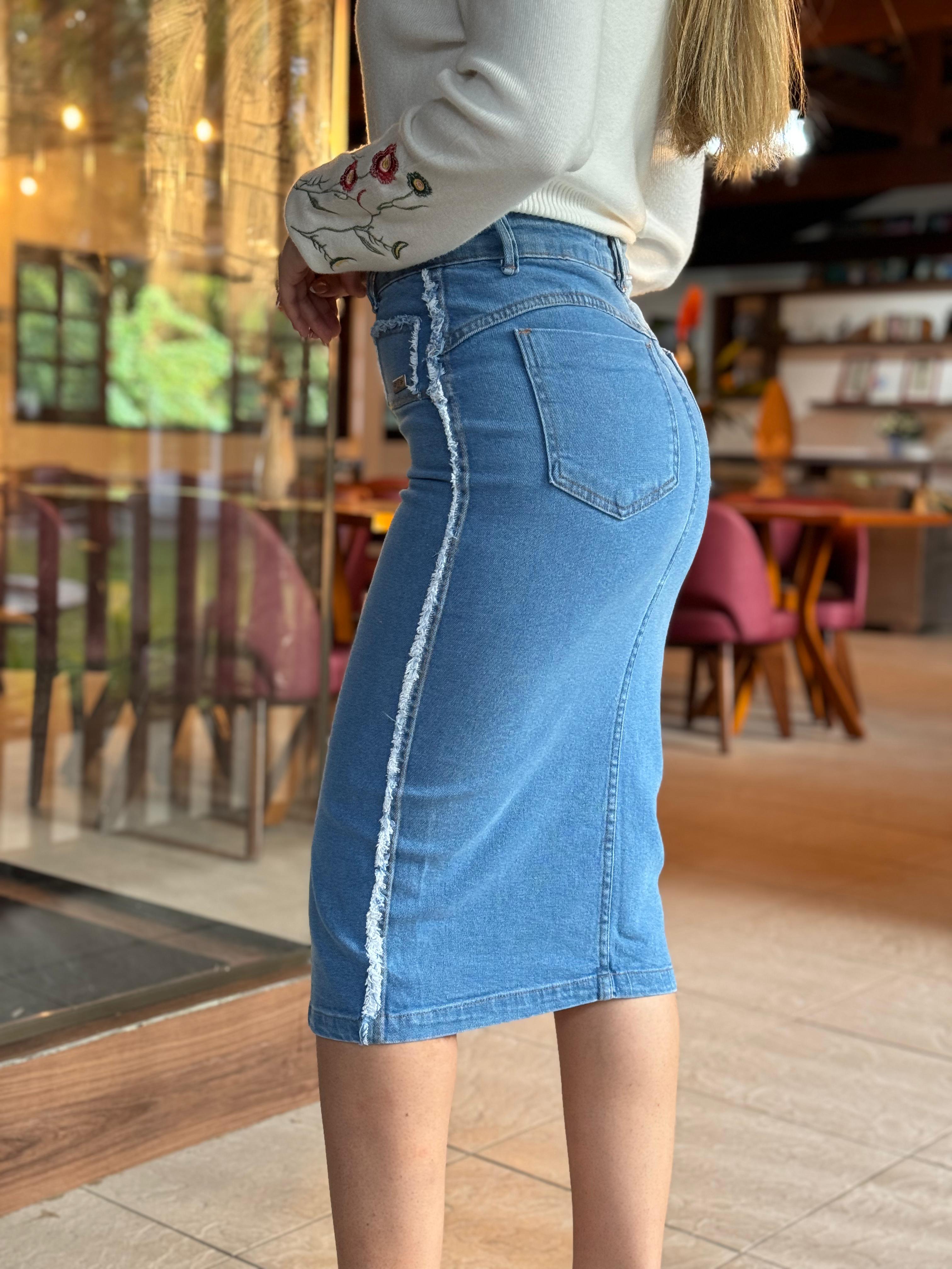 A Saia Deise é uma peça moderna e sofisticada, confeccionada em jeans premium com elastano, oferecendo um ajuste confortável e flexível. Sua composição é de 99% algodão e 1% elastano, garantindo qualidade e durabilidade ao tecido.