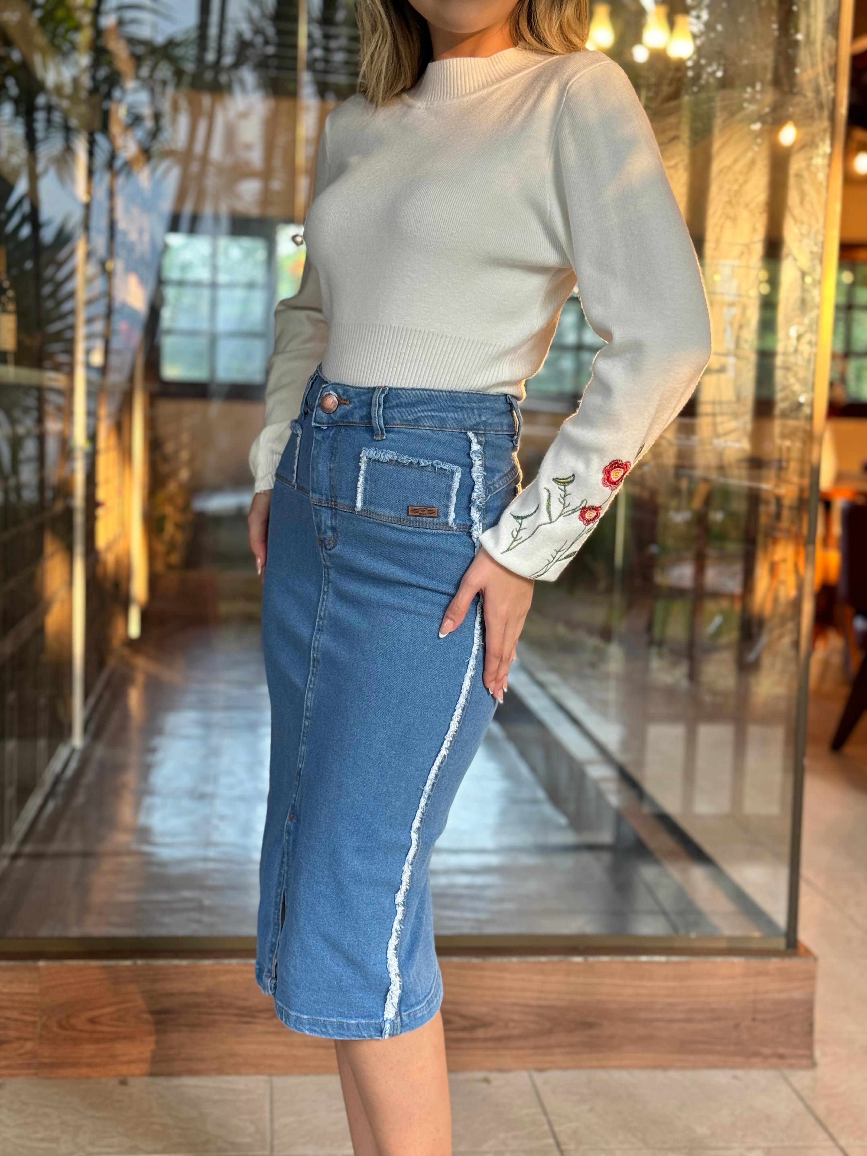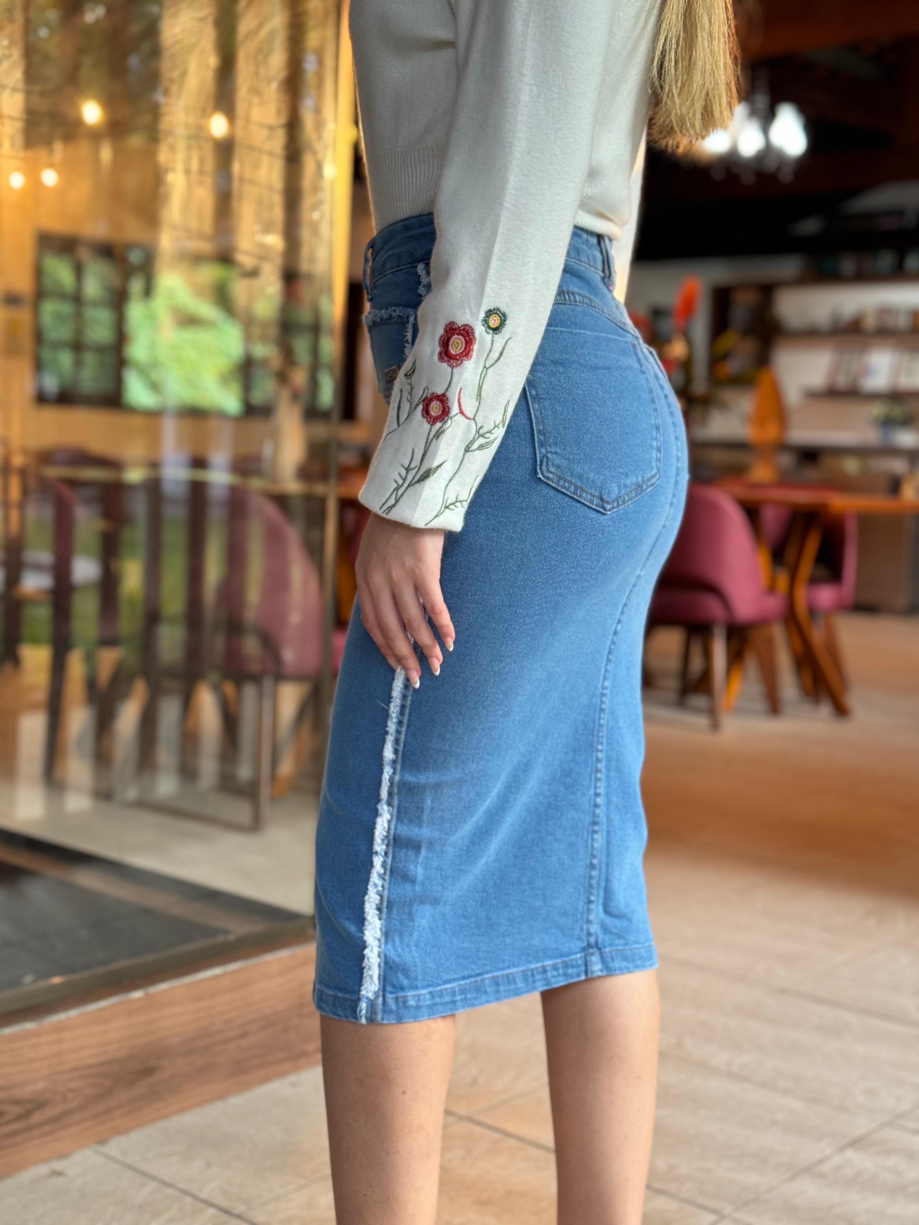 Esta saia destaca-se pelos detalhes em puído localizados na parte frontal e nas laterais, que acrescentam um toque de modernidade e estilo despojado à peça. O comprimento midi proporciona elegância, enquanto a fenda frontal adiciona um elemento de sensualidade e movimento, permitindo maior liberdade nos movimentos.
