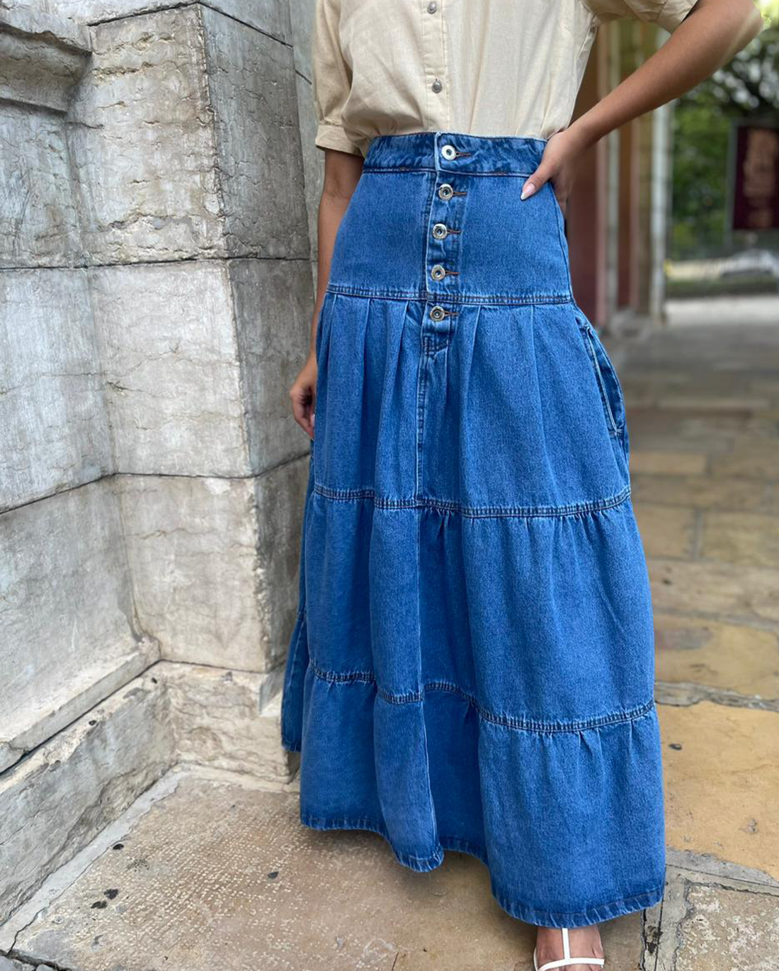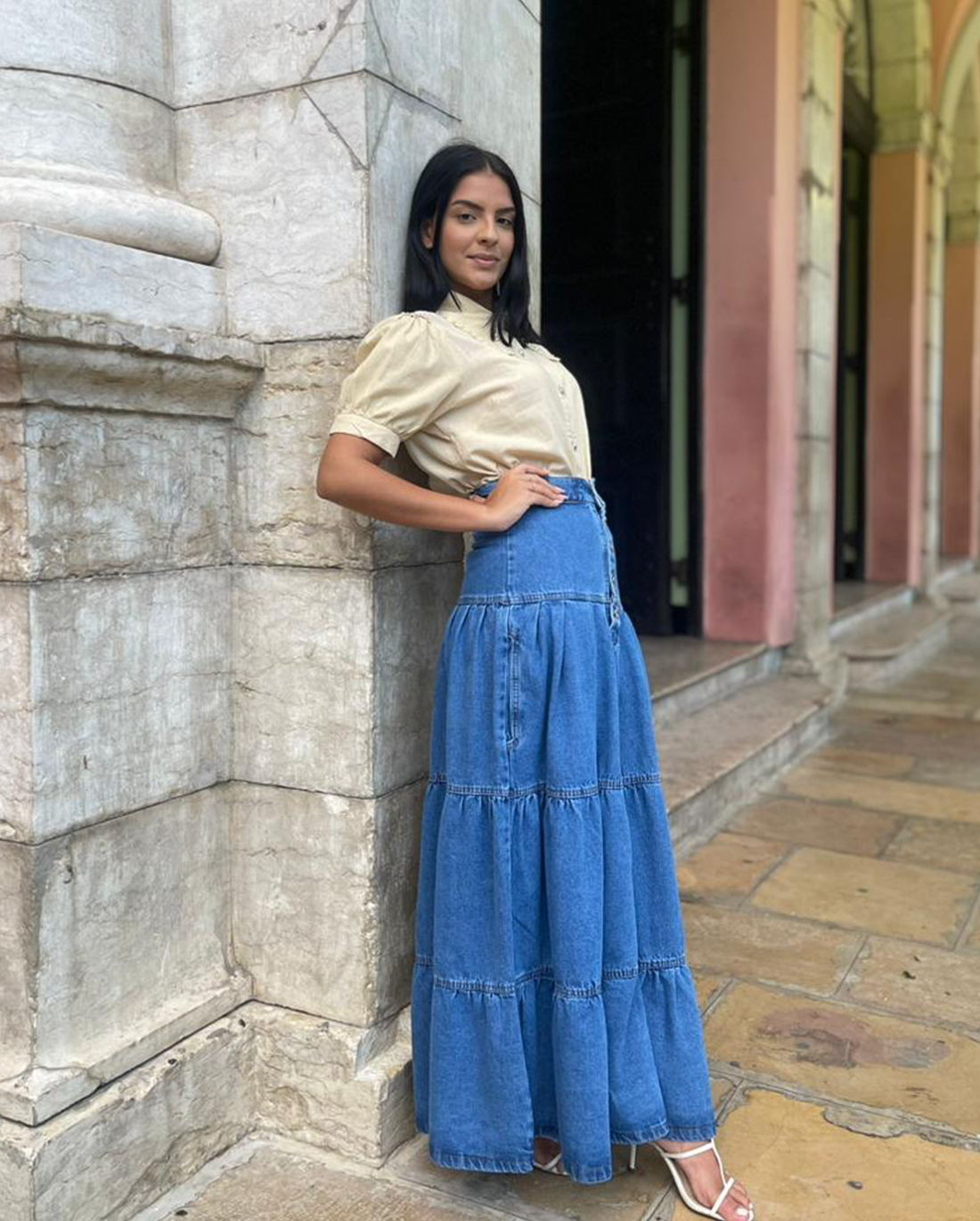 A saia Eduarda é uma peça atemporal com toque vintage e acabamento refinado. Confeccionada em jeans premium 100% algodão, ela tem estrutura firme e caimento impecável, valorizando a silhueta com conforto e estilo.