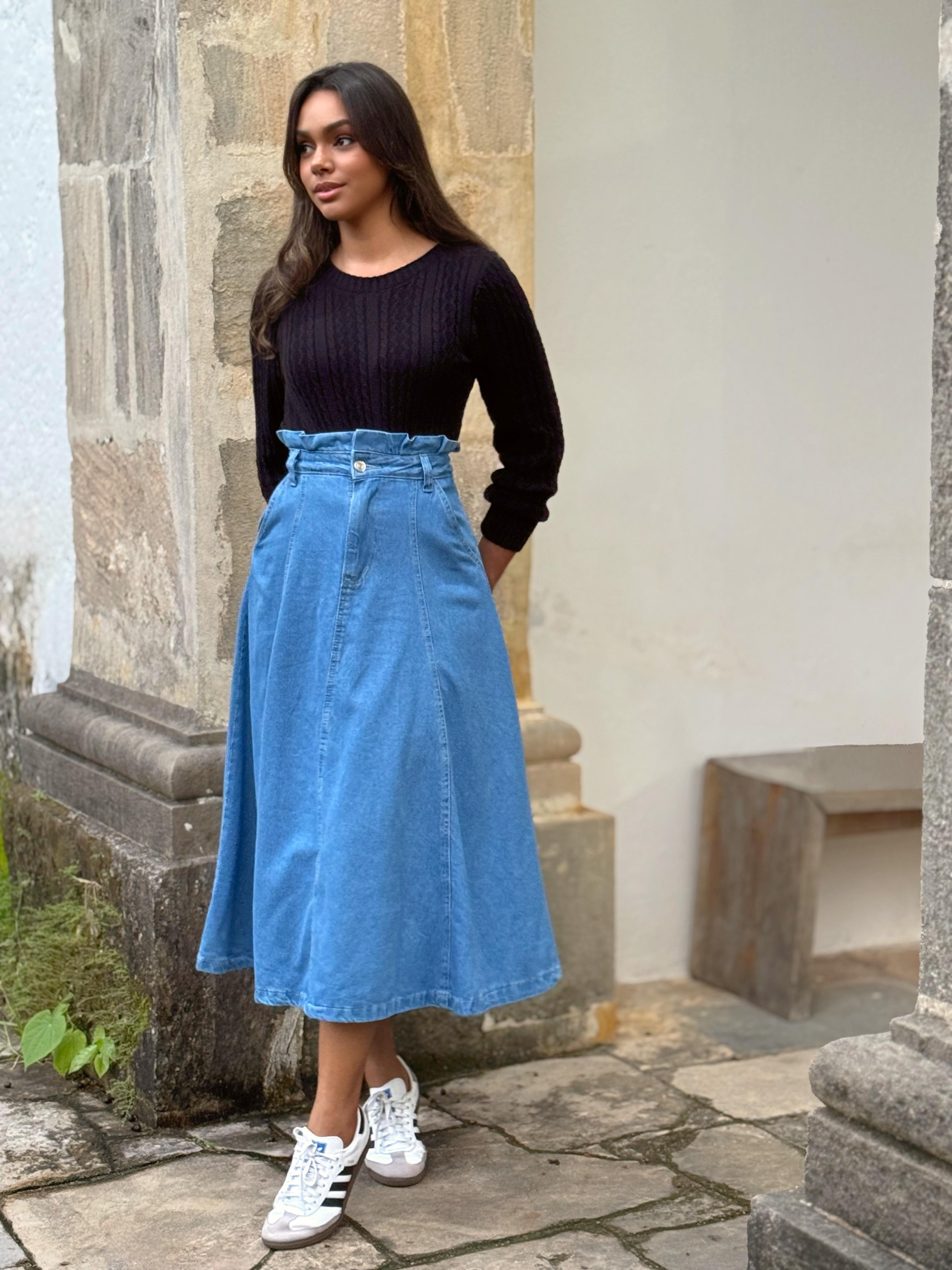 A Saia Gisele é uma peça deslumbrante com seu corte godê que proporciona um movimento fluido e elegante. Confeccionada em jeans premium 100% algodão, ela une estilo e conforto em uma única peça. Seu comprimento max midi acrescenta um toque de sofisticação, ideal para diversas ocasiões.