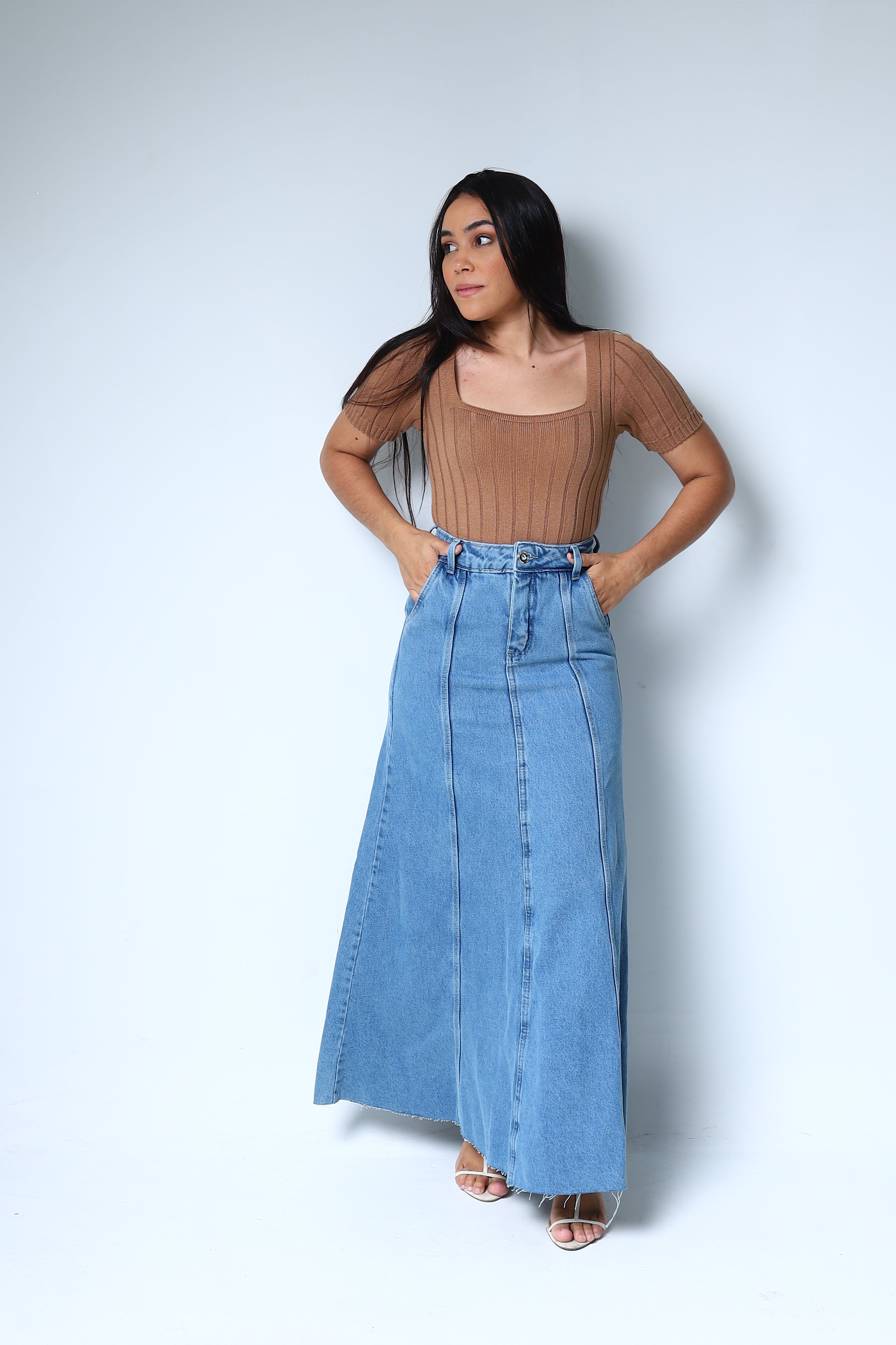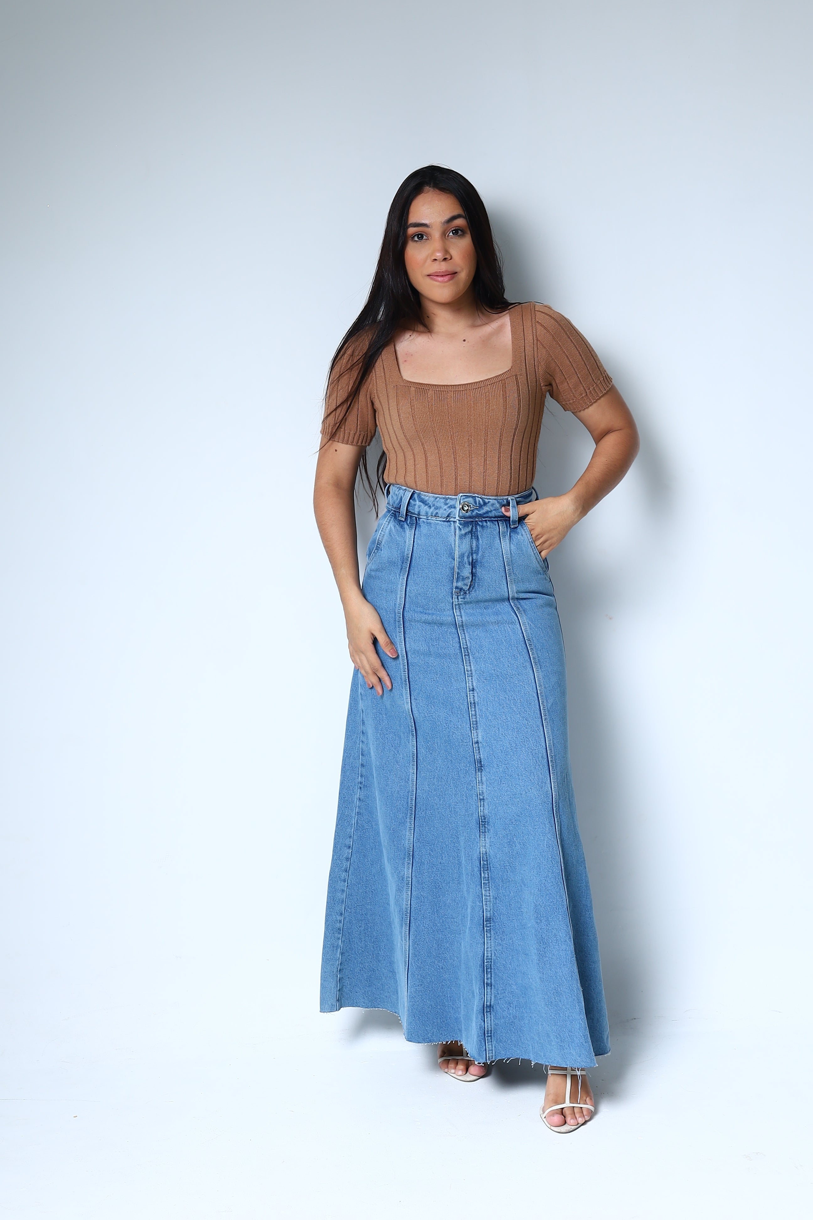 Confeccionada em jeans premium 100% algodão, a peça garante alta durabilidade, toque macio e excelente caimento. Seu tecido encorpado valoriza o corpo sem perder a leveza e o movimento natural da saia longa.
