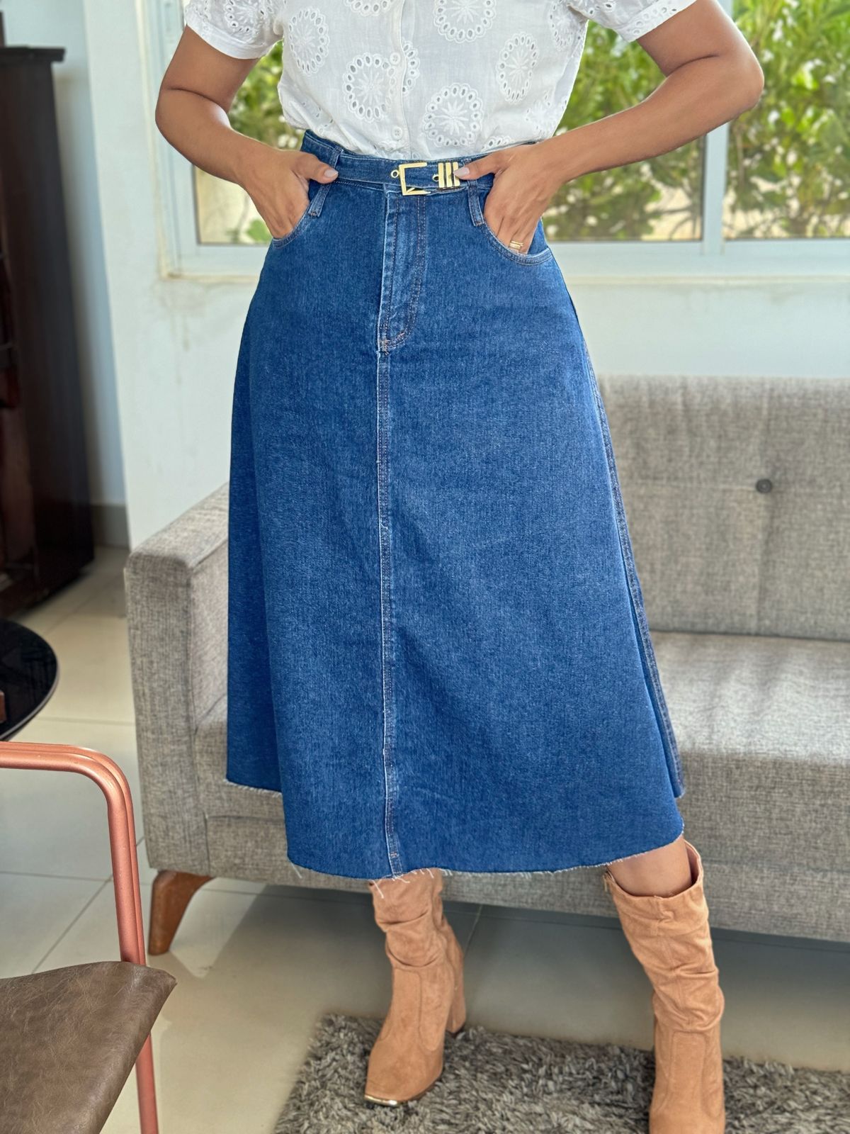 Seu comprimento geralmente fica na altura dos joelhos ou um pouco abaixo, garantindo versatilidade para compor desde produções casuais com rasteiras ou tênis, até looks mais elegantes com saltos ou botas.
