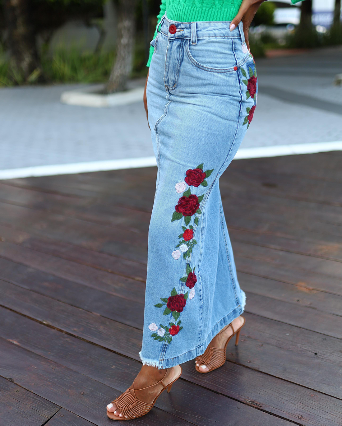 O bordado frontal, que se estende da barra ao quadril, adiciona um charme especial à saia, enquanto o bordado traseiro no bolso esquerdo acrescenta um elemento de surpresa e originalidade. Esses detalhes garantem que a Saia Maitê seja uma peça única, capaz de atrair olhares e expressar personalidade.