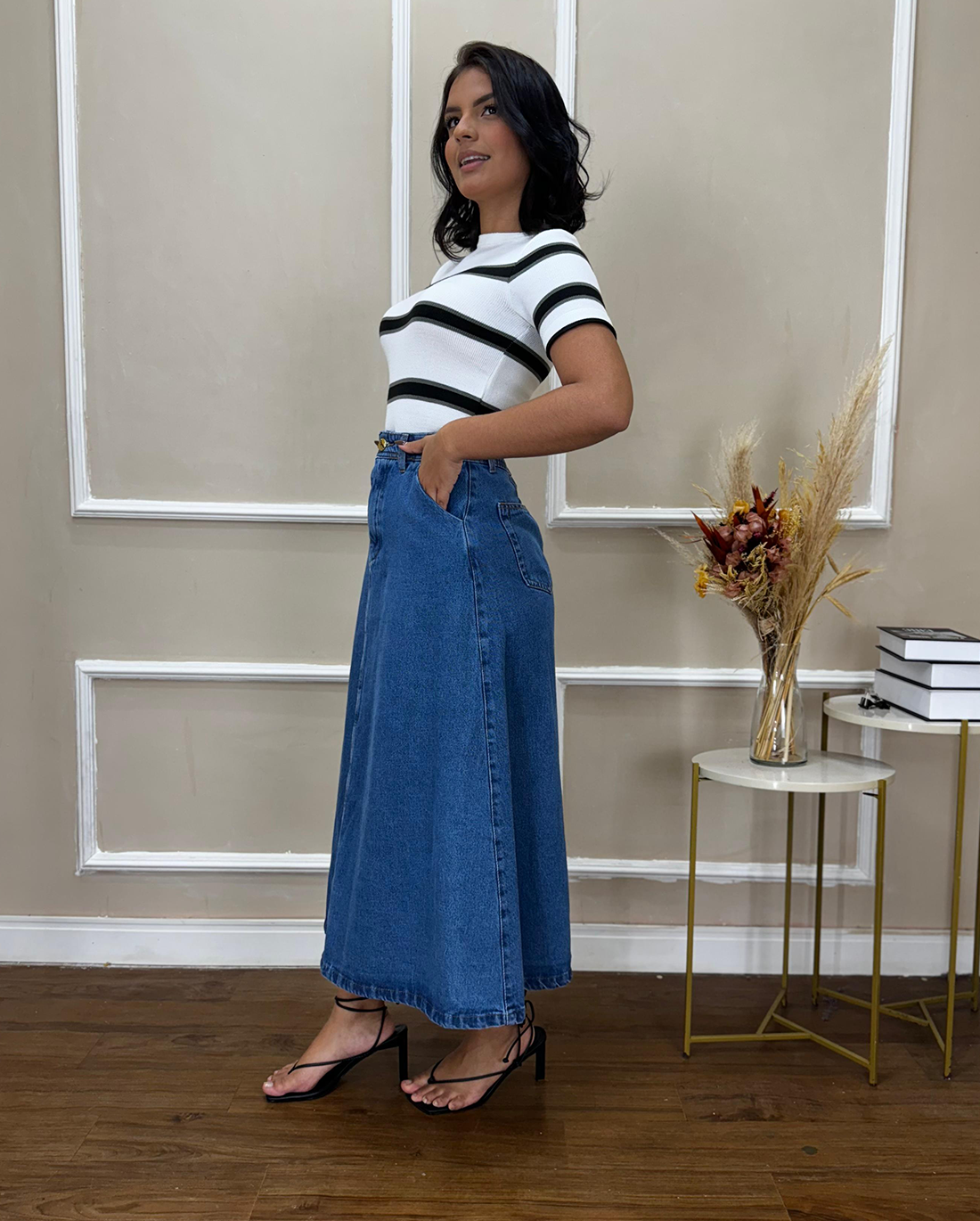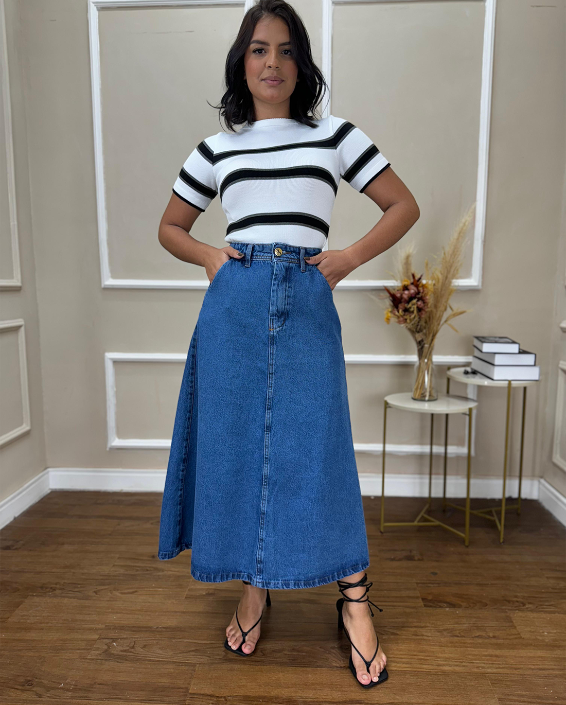 Com comprimento abaixo do joelho, a saia Mia apresenta uma charmosa modelagem, que se abre suavemente a partir da cintura, criando um caimento fluido, feminino e cheio de movimento. A cintura marcada realça a silhueta e equilibra perfeitamente a amplitude da barra, trazendo um visual romântico e atemporal.