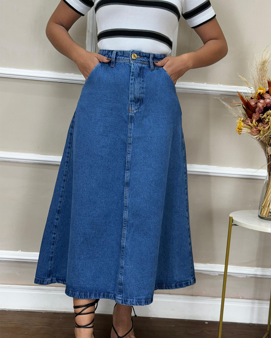 A saia Mia é uma peça clássica com alma contemporânea, perfeita para quem valoriza elegância com um toque de leveza. Confeccionada em jeans premium de alta qualidade, ela oferece estrutura, conforto e um acabamento impecável que garante sofisticação até nos looks mais casuais.