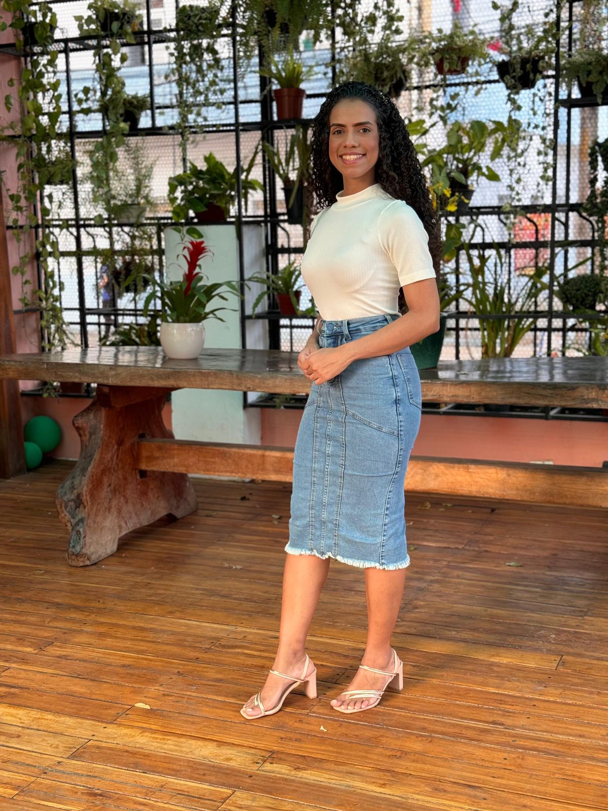 A Saia Milena é a escolha ideal para quem busca elegância, autenticidade e versatilidade em uma única peça. Com modelagem mídi atemporal, ela é confeccionada em jeans 100% algodão premium, oferecendo qualidade superior, estrutura impecável e um toque natural ao vestir.