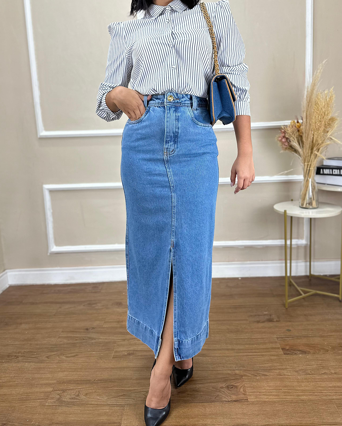 A saia Noemi é uma peça elegante e versátil, ideal para quem busca sofisticação com um toque de sensualidade. De comprimento longo, ela apresenta uma silhueta fluida que valoriza o corpo com leveza e movimento. O destaque fica por conta da fenda frontal, que adiciona charme e modernidade ao visual, revelando as pernas de forma sutil e refinada. Perfeita para composições que vão do dia à noite, a Noemi combina perfeitamente com blusas mais ajustadas, croppeds ou camisas, criando looks autênticos e femininos.