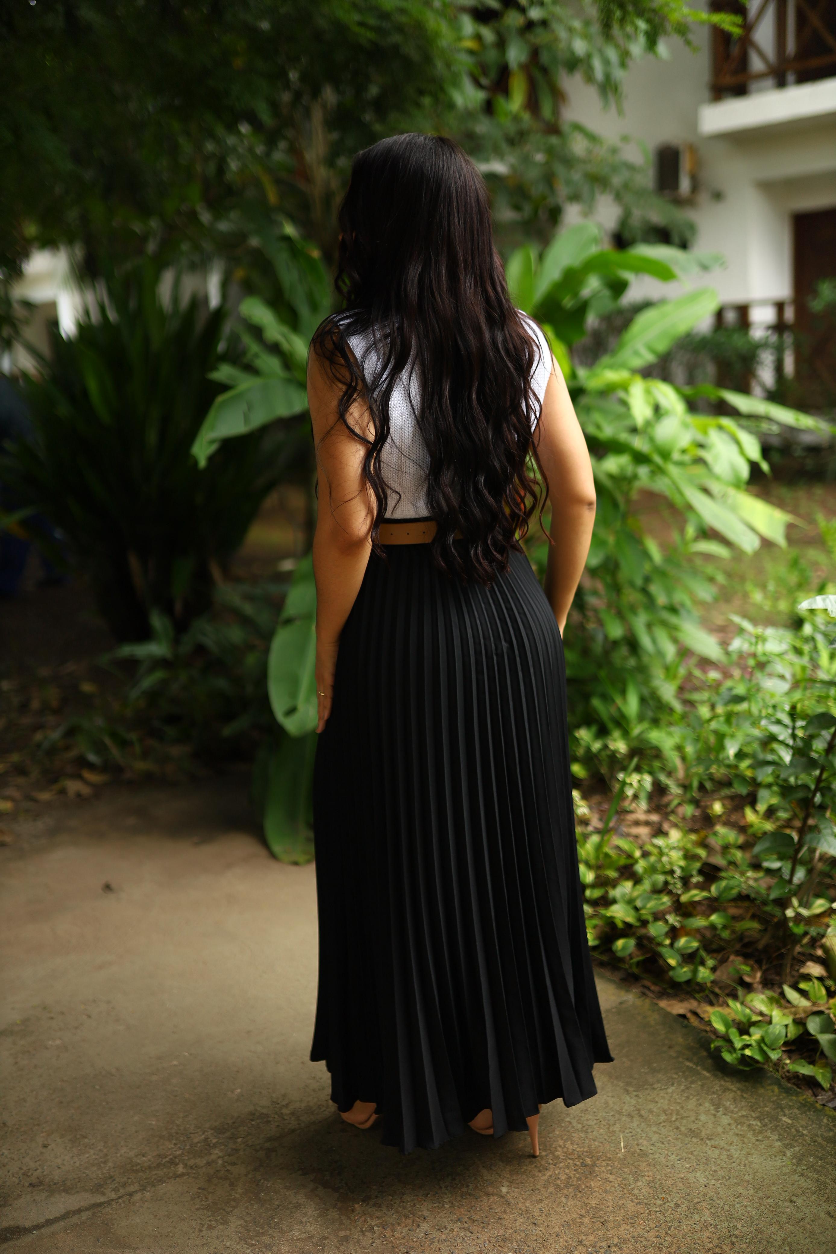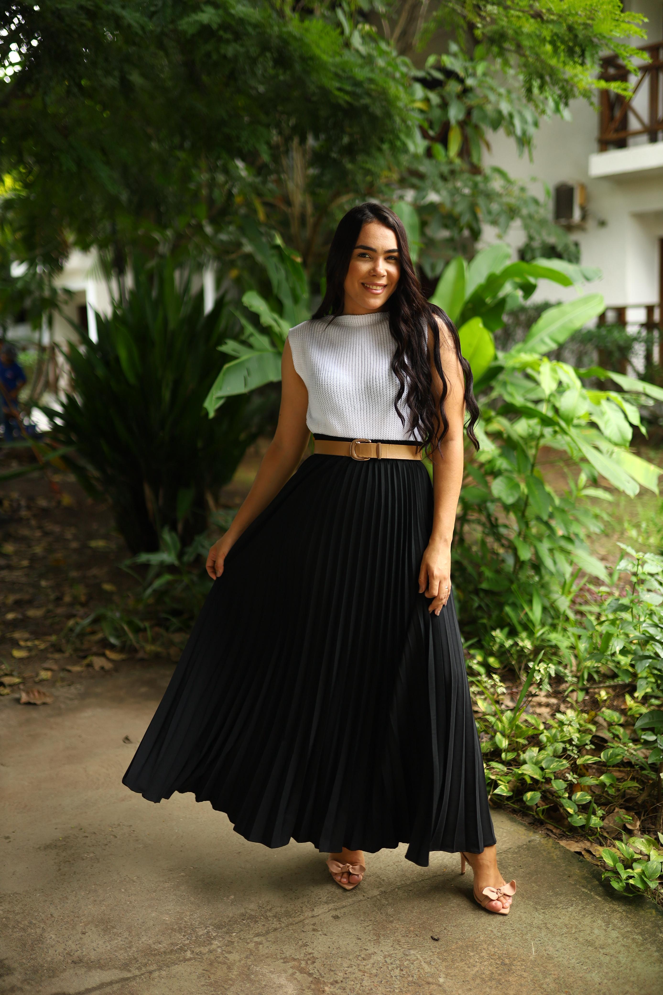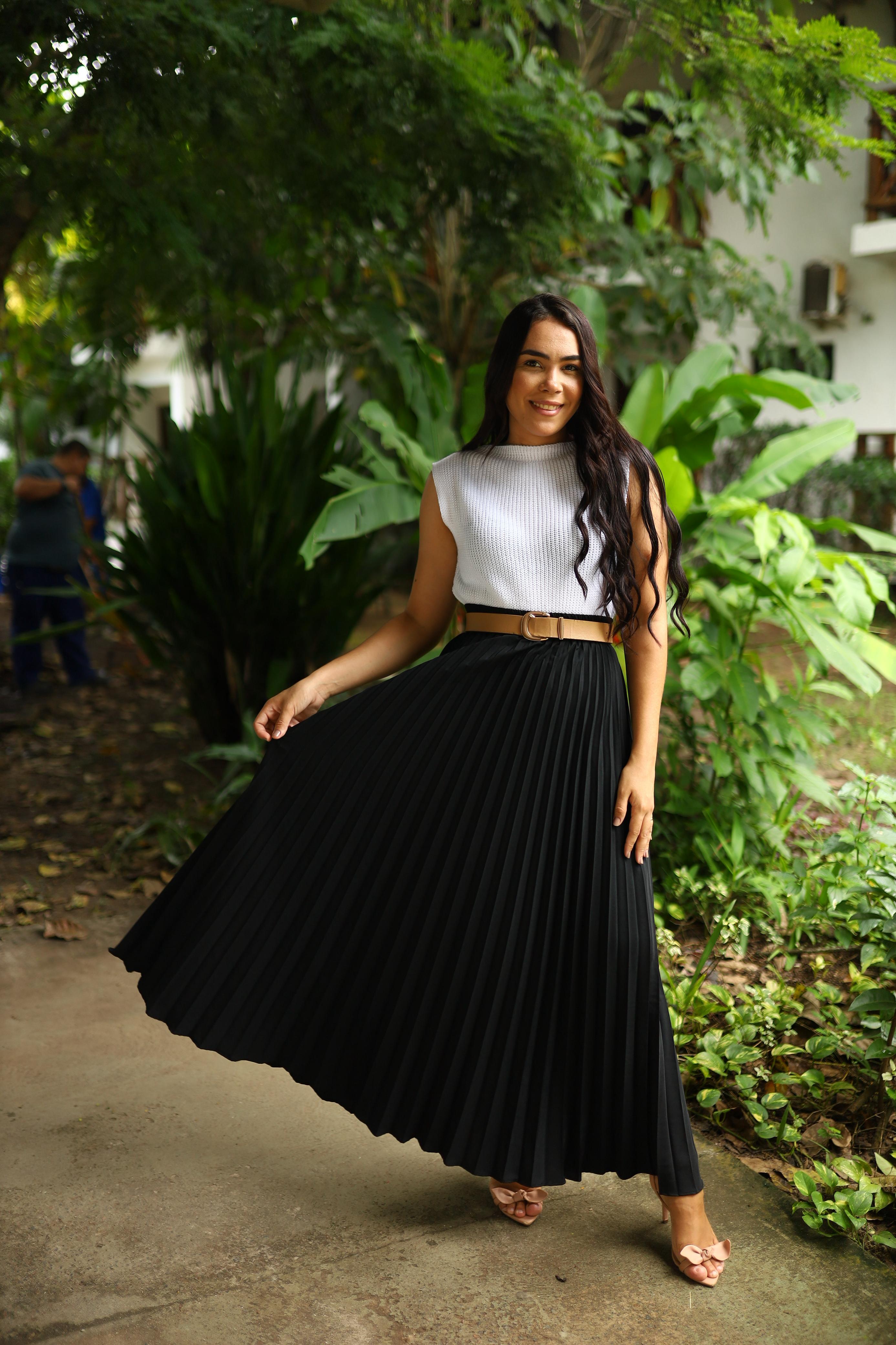 Com plissado fino e caimento impecável, esta saia longa é puro movimento e elegância. Confeccionada em tecido de alta qualidade, valoriza a silhueta com cintura alta e toque leve. Um clássico repaginado para produções sofisticadas e atemporais.