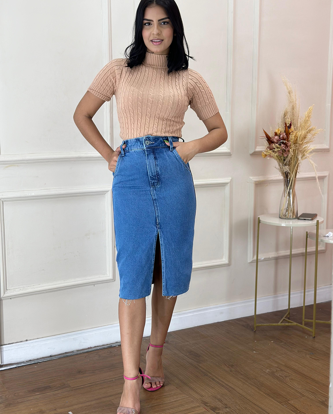 Com comprimento midi, a saia tem uma proposta sofisticada e versátil — perfeita para transitar do casual ao mais arrumado. A modelagem levemente ajustada, acompanhando a silhueta de forma sutil e valorizando a cintura com um acabamento limpo e moderno.