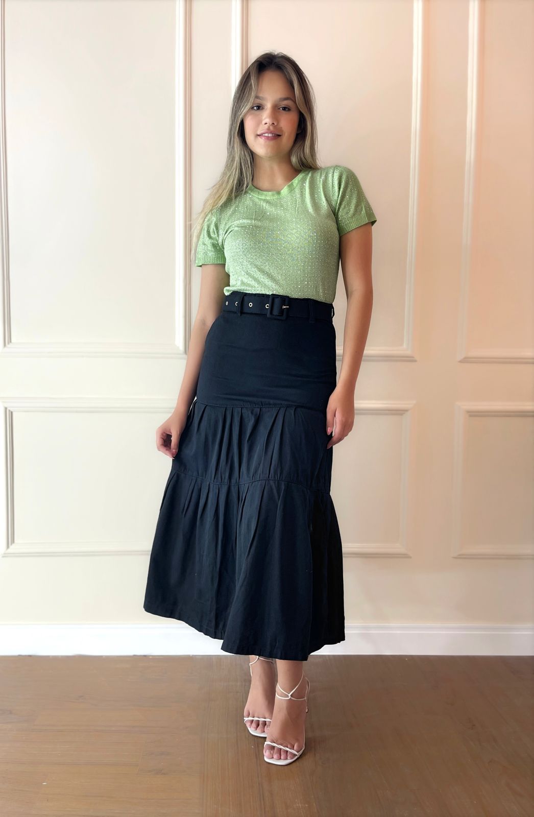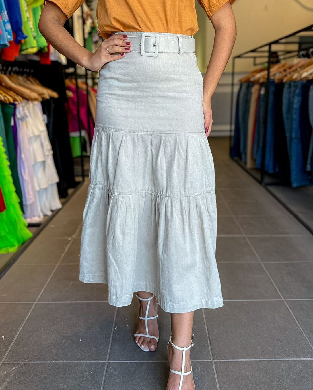 Ideal para ocasiões casuais ou eventos mais arrumadinhos, ela combina bem com blusas mais sequinhas, regatas ou até mesmo camisas leves por dentro da saia, realçando o detalhe do cinto.
