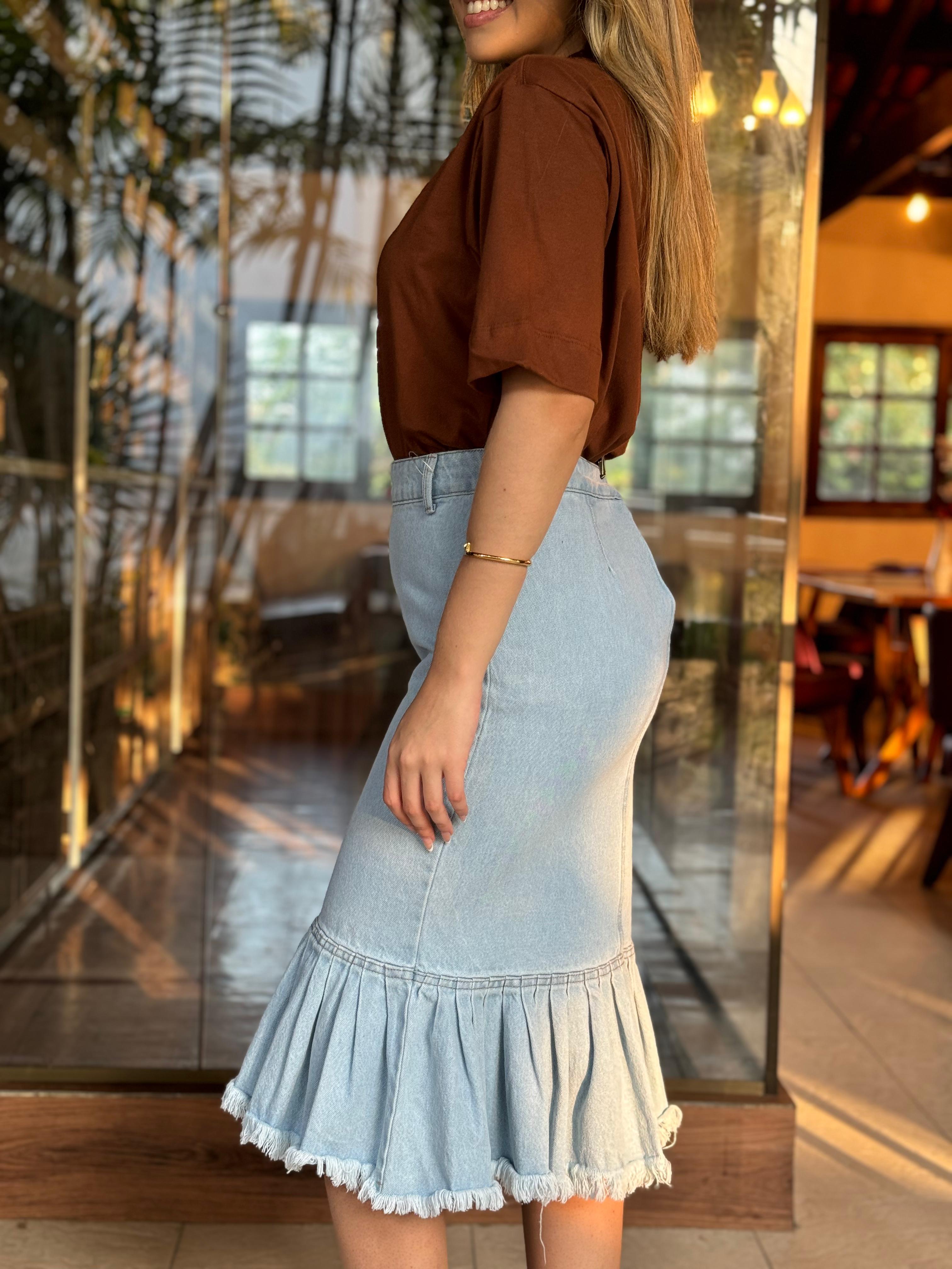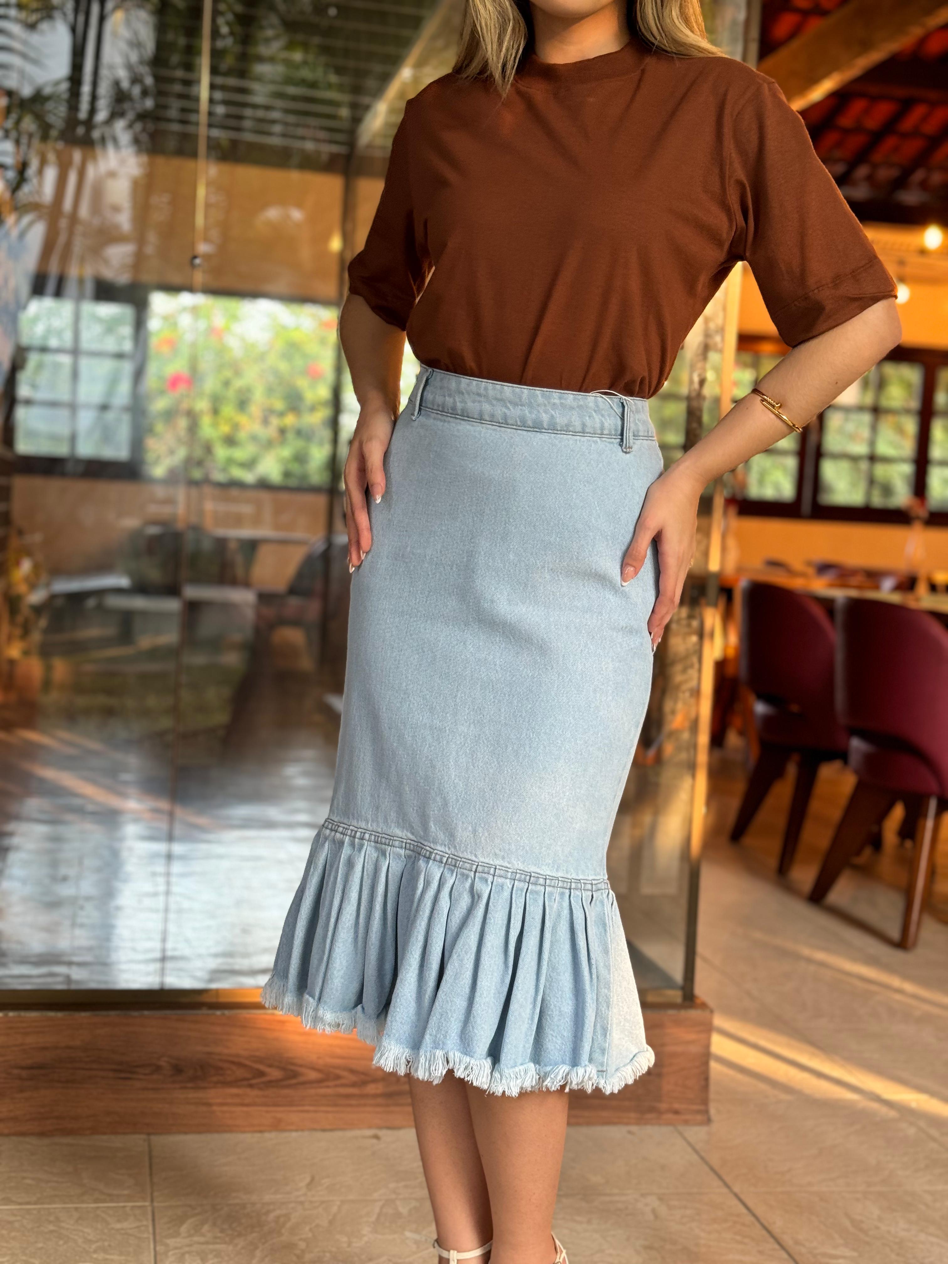Essa descrição destaca como a saia jeans midi modelo lápis Veronica é uma peça prática e estilosa, ideal para diversas ocasiões no dia a dia.