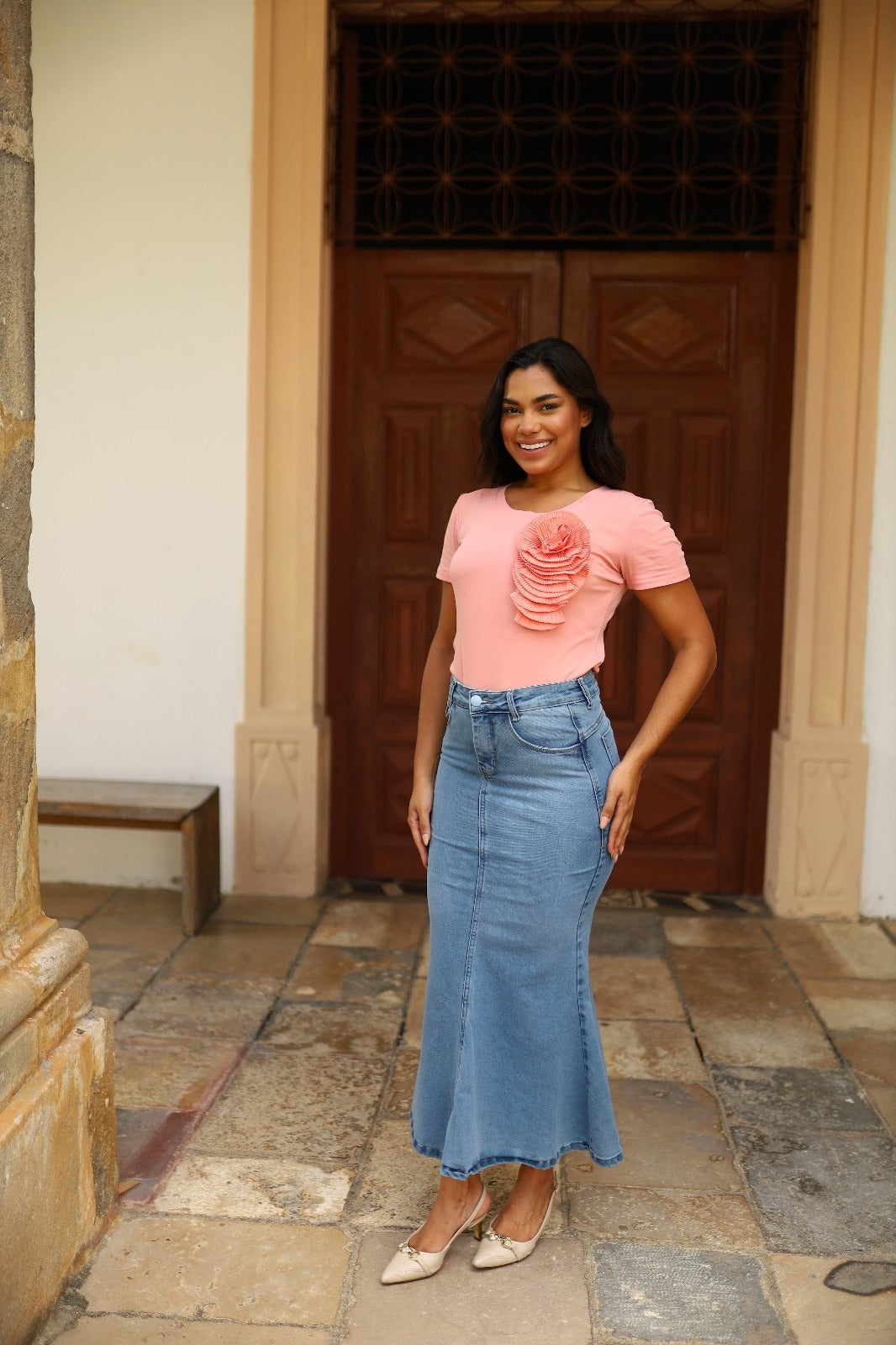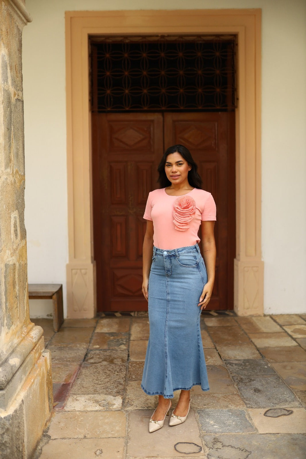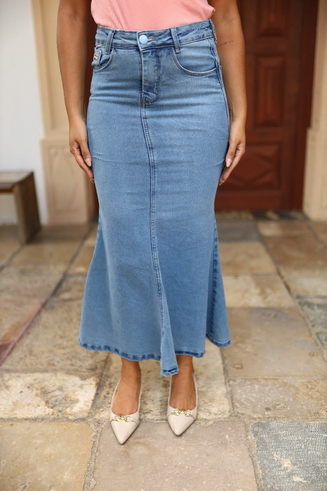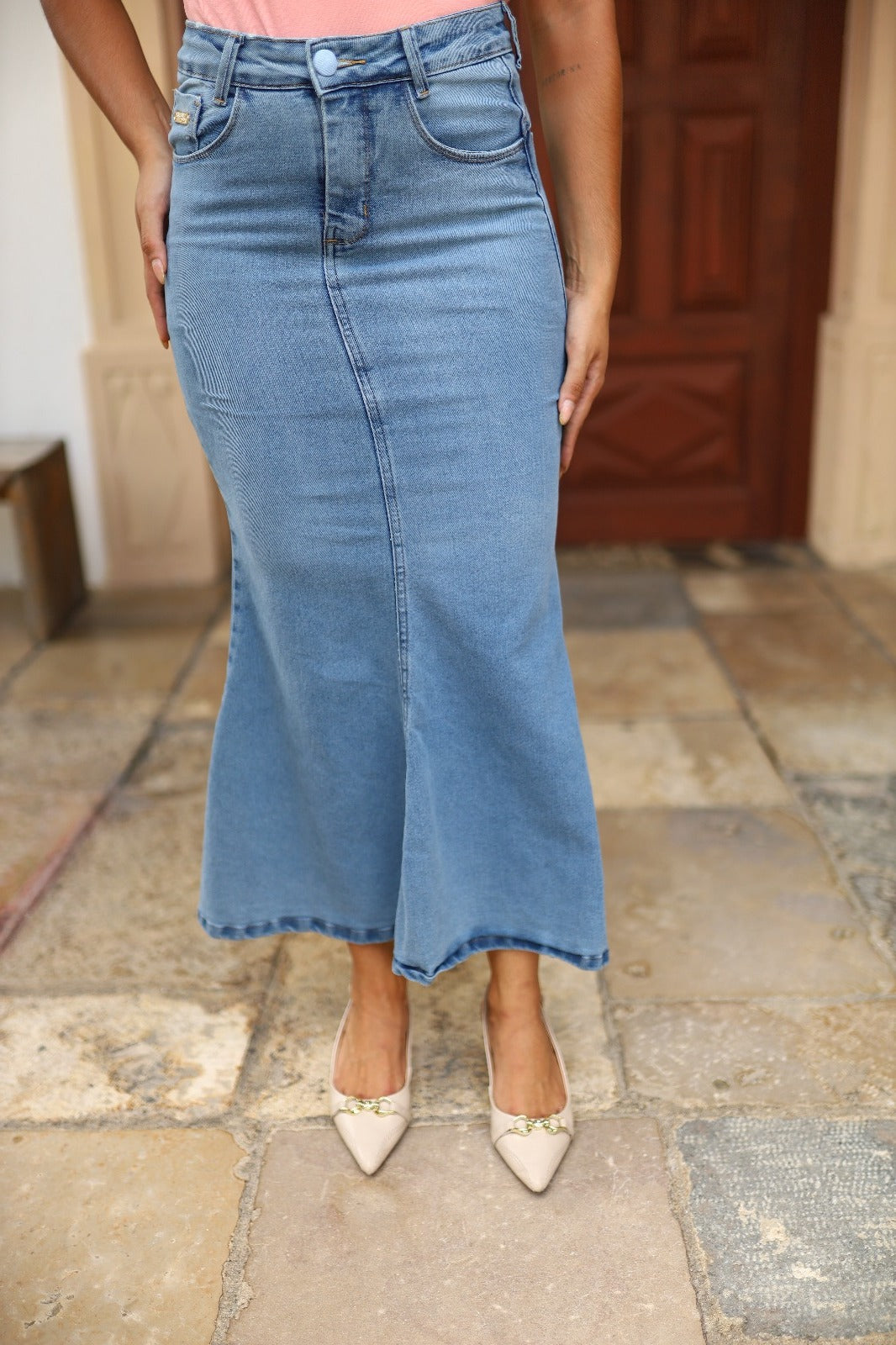 A saia "cauda de sereia" em jeans premium com elastano é uma peça bastante interessante e cheia de personalidade! Esse modelo, que se ajusta ao corpo até os joelhos e vai se alargando para a parte de baixo, imita a forma da cauda de sereia, proporcionando um visual mais sensual e ao mesmo tempo sofisticado.