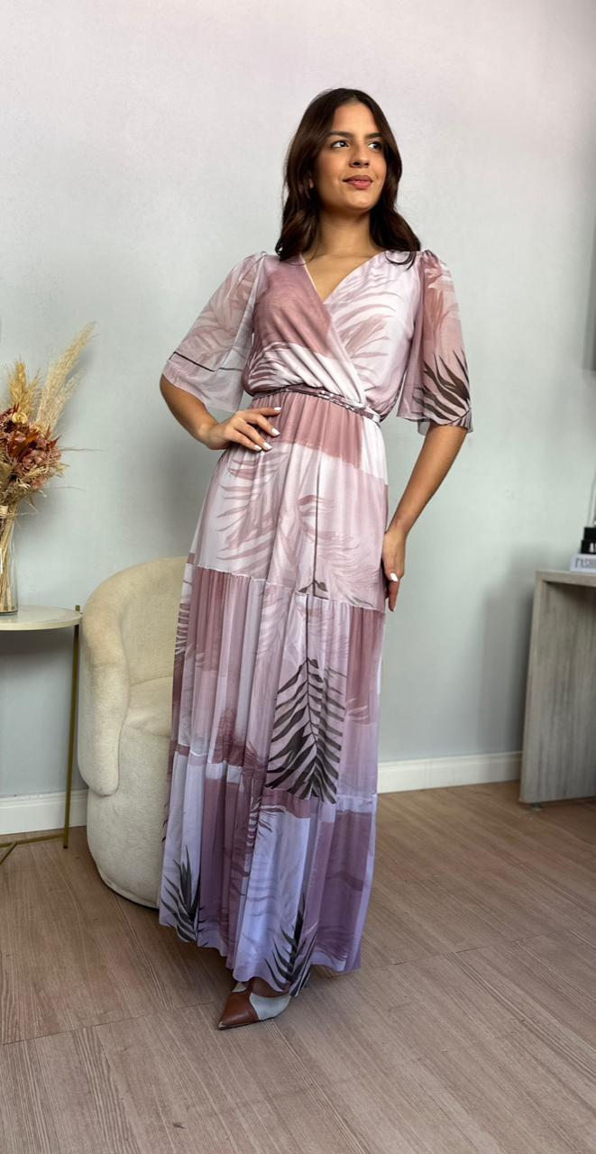 Com decote em V, o modelo valoriza o colo e alonga a silhueta, enquanto o tule confere um caimento leve e fluido, criando movimento a cada passo. Ideal para ocasiões especiais ou para quem deseja um visual sofisticado com um toque sonhador.