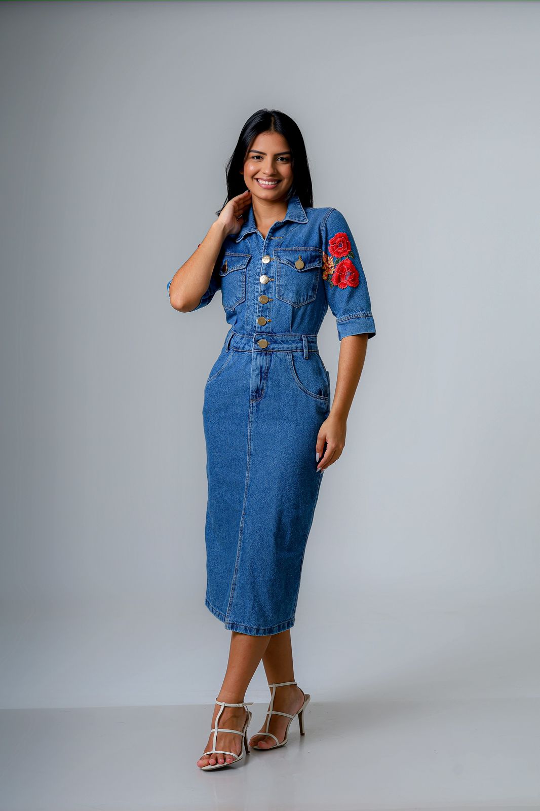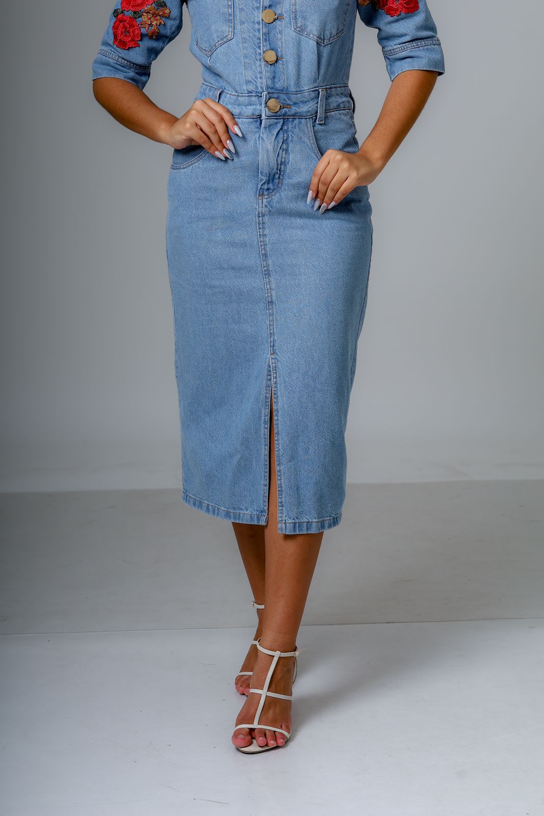 O grande diferencial está em — uma fenda profunda e elegante que revela as pernas com charme e movimento, equilibrando a doçura dos bordados com uma sensualidade sutil. Esse contraste cria um visual sofisticado e impactante, ideal para ocasiões especiais onde o protagonismo é desejado.